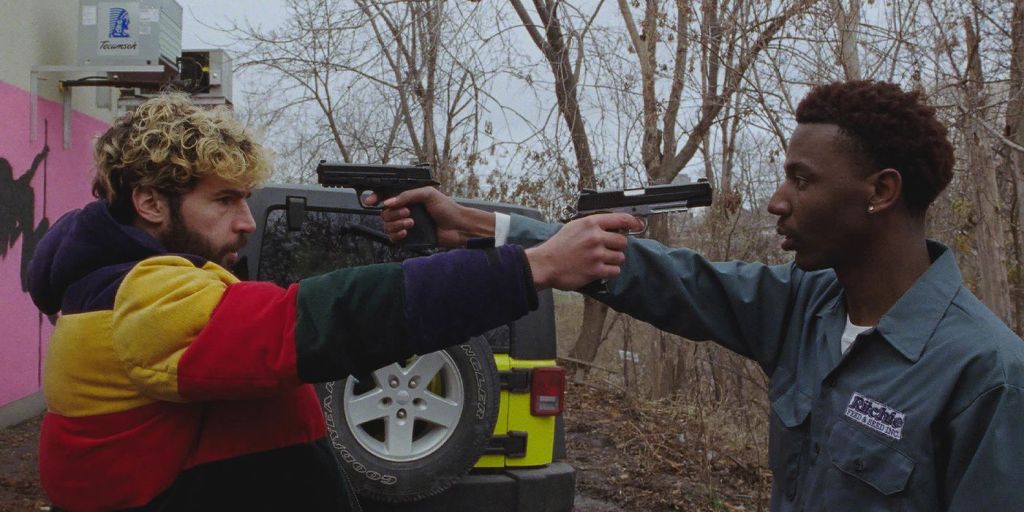 Kevin has always wanted to die and Val sees death as the best resolution to his situation, so he busts Kevin out of the mental ward, hands him a backpack with a couple of guns and proposes that they do this one last thing for each other. That image above – of Kevin and Val pointing guns at one another – is not a tease. They are poised, fairly early on and ready to do the deed, but Kevin wants to wait until later. Take the rest of the day, settle some scores, check in on some bucket-list type situations, before taking their final shots.